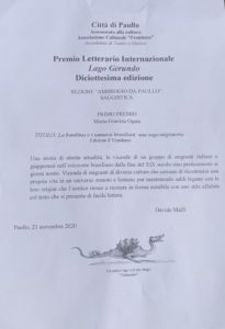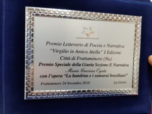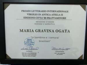 Tive a alegria de ser contemplada com o Prêmio Especial do Juri (Premio Speciale della Giuria). Tal evento se realizou na cidade italiana de Frattaminore, que se situa nas proximidades de Nápoles, em novembro de 2019. Participei da Seção de Narrativa com meu livro “La bambina e i samurai brasiliani: una saga migratoria”, publicado em fevereiro desse mesmo ano pela casa editorial Edizioni Il Viandante.